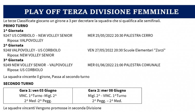 Alla Terza Divisione di Paolo diciamo soltanto che tutto il Corbiolo sarà al loro fianco nelle due sfide contro Roverchiara (mercoledì in casa) e Valpovolley (venerdì in trasferta) per cercare di arrivare alle finali che apriranno le porte alla 2^ Divisione.